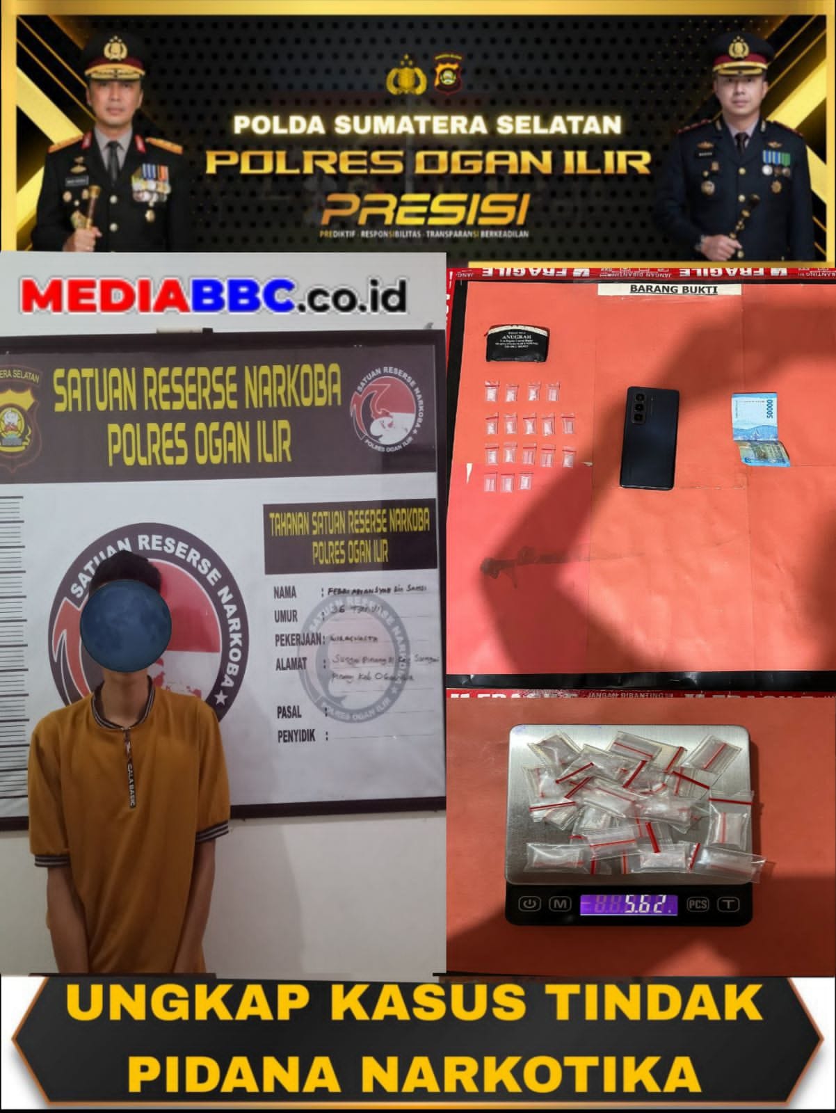 MEDIABBC.co.id, OGAN ILIR — Polda Sumatera Selatan kembali menegaskan komitmennya dalam memberantas peredaran gelap narkotika melalui keberhasilan Satresnarkoba Polres Ogan Ilir mengungkap kasus pengedaran sabu di wilayah pedesaan.