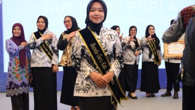 MEDIABBC.co.id – OKI — Dalam Acara Puncak Peringatan Hari Ulang Tahun (HUT) Persatuan Guru Republik Indonesia (PGRI) ke-80 tahun tingkat Provinsi Sumatera Selatan, Ketua Tim Penggerak PKK Kabupaten Banyuasin, Nabila Askolani Putri dikukuhkan sebagai Ibunda Guru Kabupaten Banyuasin digelar di Gedung Perahu Kajang Kayu Agung, Kabupaten Ogan Komering Ilir, Selasa (2/12/2025).