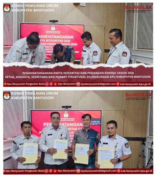 MEDIABBC.co.id – BANYUASIN – Komisi Pemilihan Umum (KPU) Kabupaten Banyuasin menegaskan komitmennya dalam menjaga integritas lembaga. Hal ini ditandai dengan keikutsertaan KPU Banyuasin dalam Penandatanganan Pakta Integritas dan Perjanjian Kinerja Tahun 2026 yang digelar serentak se-Sumatera Selatan secara virtual,kamis (15-01-26).