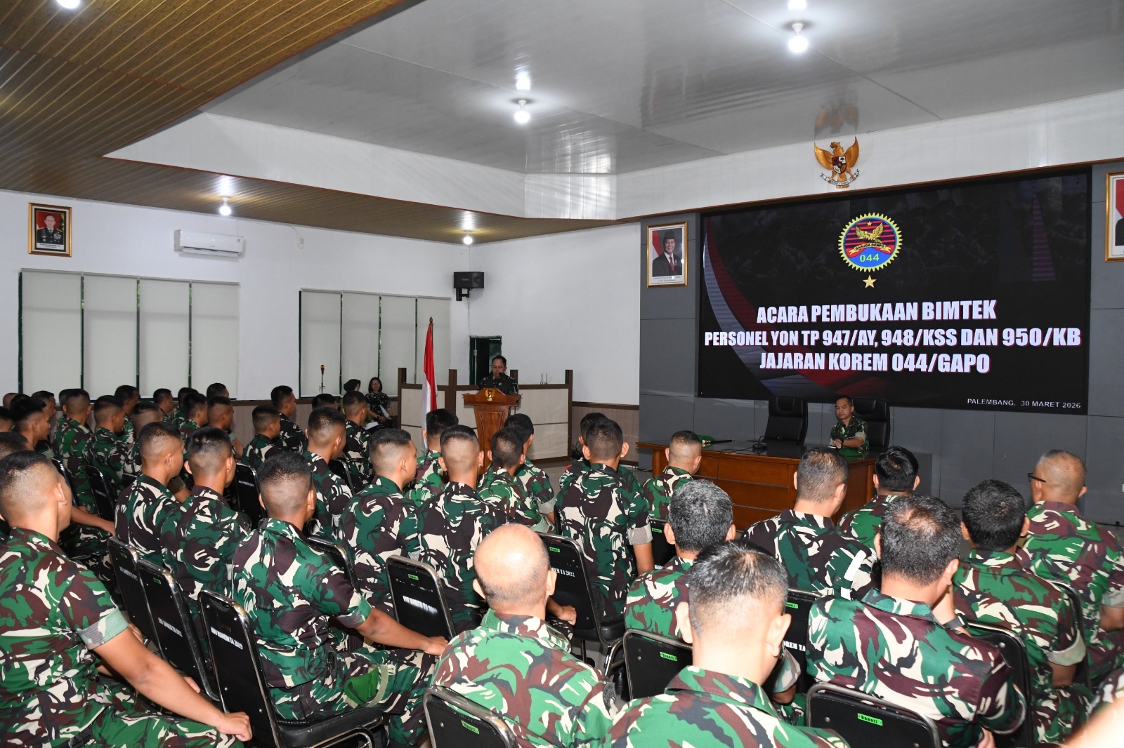 MEDIABBC.co.id |Palembang – Komando Resor Militer 044/Garuda Dempo menggelar kegiatan pembukaan Bimbingan Teknis bagi personel staf Batalyon TP jajaran Korem 044/Gapo. Kegiatan ini secara resmi dibuka langsung oleh Komandan Korem 044/Gapo, Brigjen TNI Khabib Mahfud, Senin (30/3/2026).