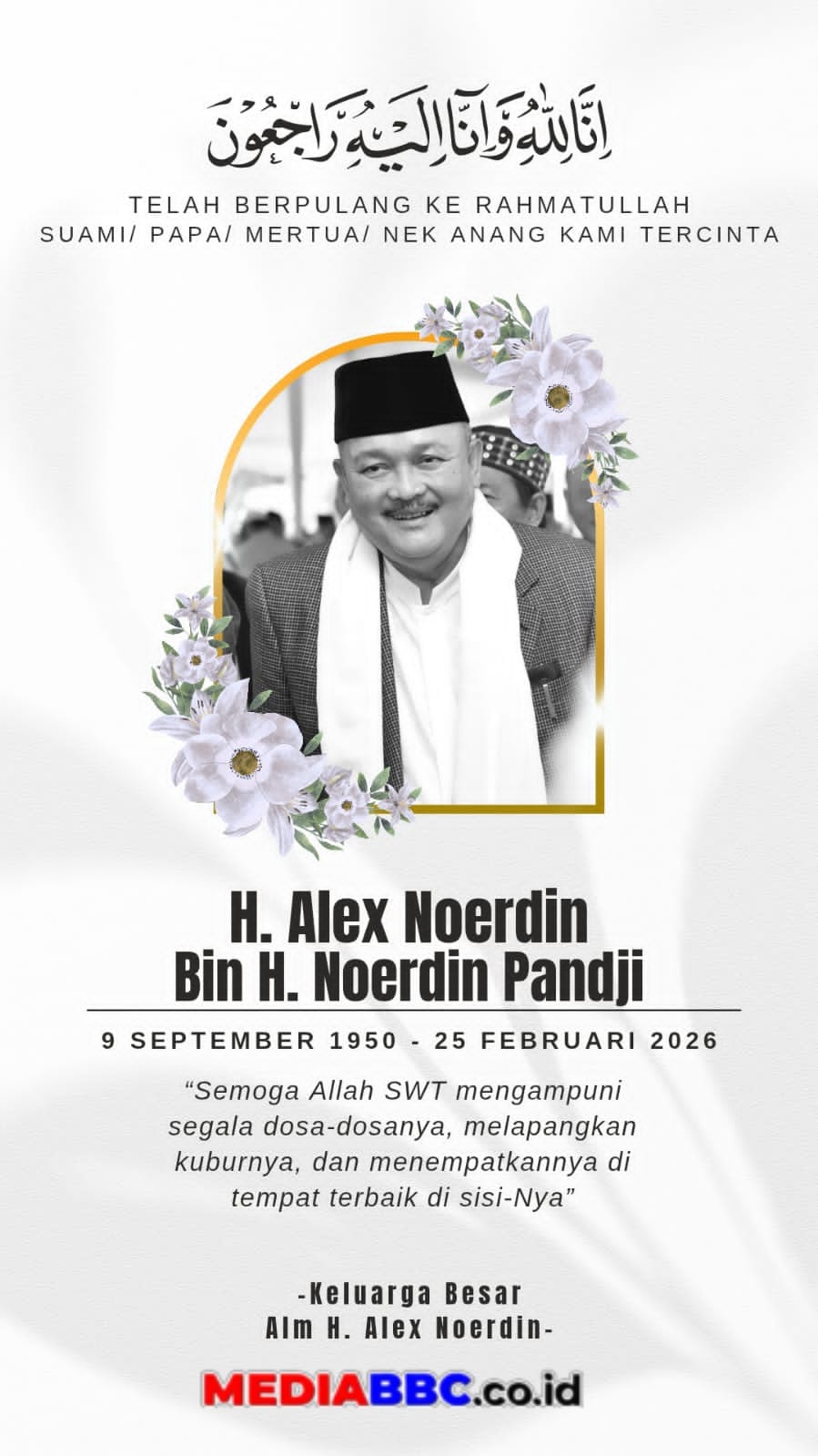 MEDIABBC.co.id, JAKARTA — Kepergian mantan Gubernur Sumatera Selatan, H Alex Noerdin, pada Rabu (25/2/2026) pukul 13.30 WIB di RS Siloam Semanggi Jakarta menandai berakhirnya satu bab penting dalam sejarah politik daerah Sumatera Selatan. Ia wafat dalam usia 75 tahun setelah menjalani perawatan intensif di ruang ICU akibat komplikasi penyakit yang dideritanya.