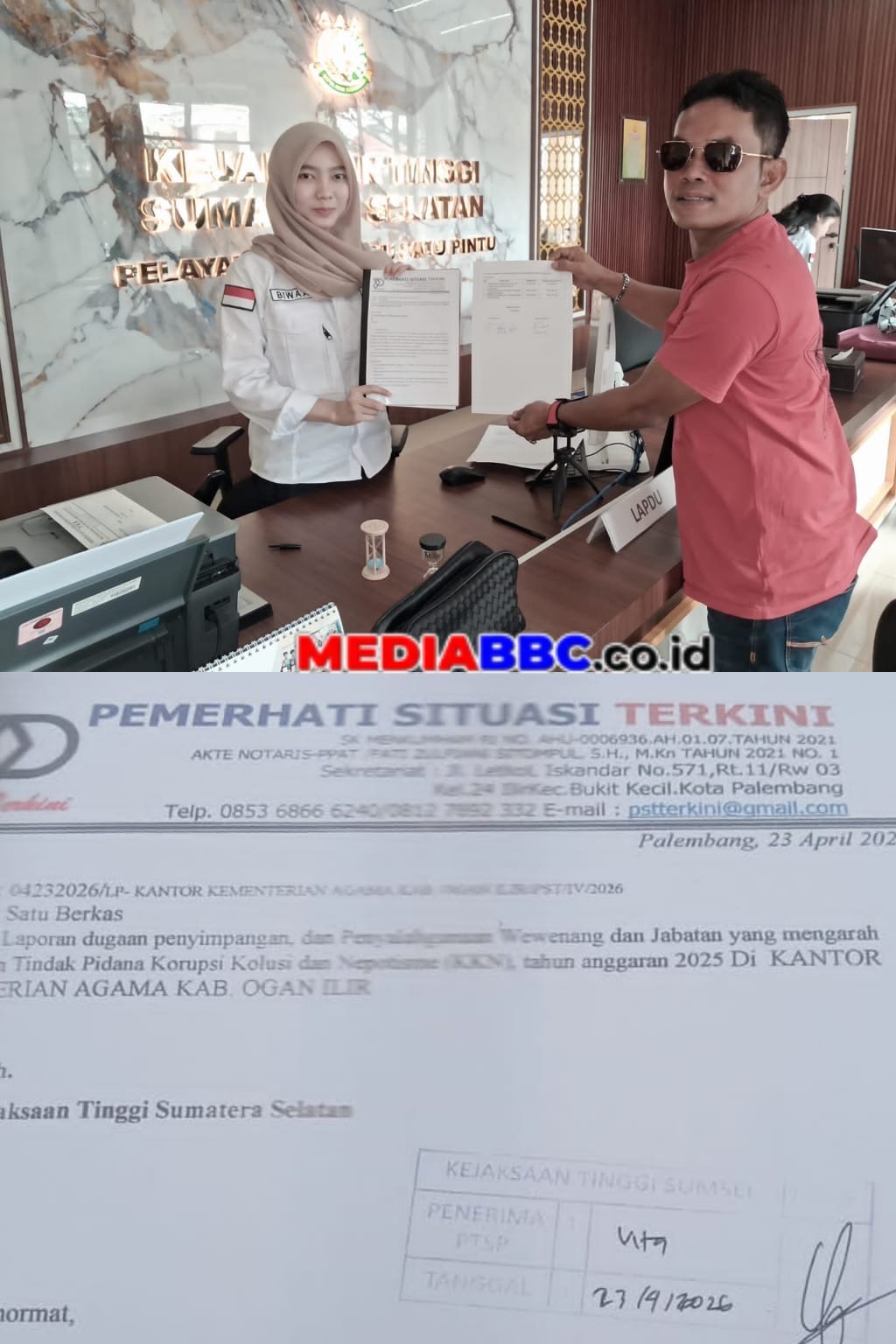 MEDIABBC.co.id, PALEMBANG – Dugaan praktik lancung di lingkungan Kantor Kementerian Agama (Kemenag) Kabupaten Ogan Ilir akhirnya dibongkar ke publik. Lembaga Swadaya Masyarakat Pemerhati Situasi Terkini (LSM PST) resmi melayangkan Laporan Pengaduan (Lapdu) ke Kejaksaan Tinggi Sumatera Selatan, Kamis (23/4/2026), terkait indikasi “Dugaan korupsi uang negara dalam pengelolaan dana DIPA tahun 2025 yang mencapai Rp57,6 miliar.