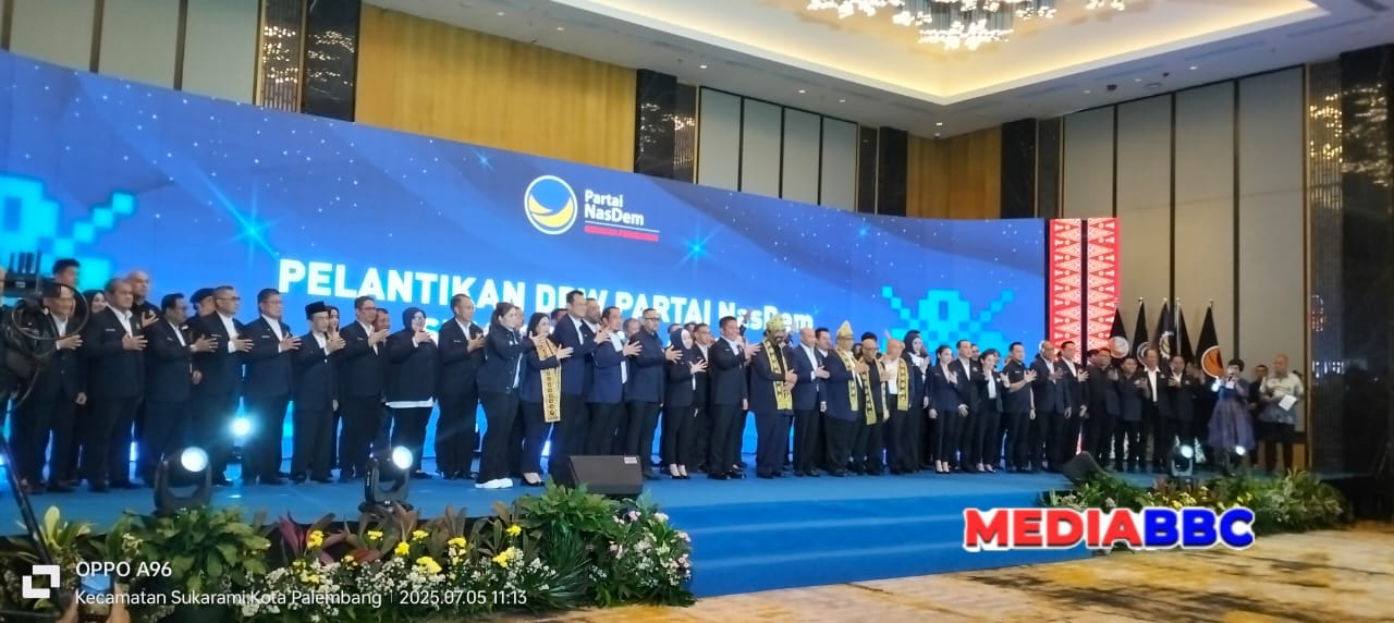 MEDIABBC.co.id – Palembang. – Ketua Umum DPP Partai NasDem, H. Surya Paloh, secara resmi melantik jajaran Pengurus, Dewan Pertimbangan, Dewan Pakar, Sayap, dan Badan Partai DPW NasDem Sumatera Selatan (Sumsel) periode 2025-2029 pada Sabtu (5/7/2025) di Hotel Santika Bandara Palembang.