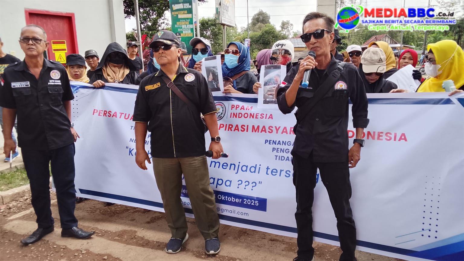 Ratusan massa dari Persatuan Pendamping Aspirasi Masyarakat Indonesia (PPAMI) menggelar aksi damai di depan kantor Kejaksaan Tinggi Sumatera Selatan (Kejati Sumsel) pada Selasa (14/10/2025).