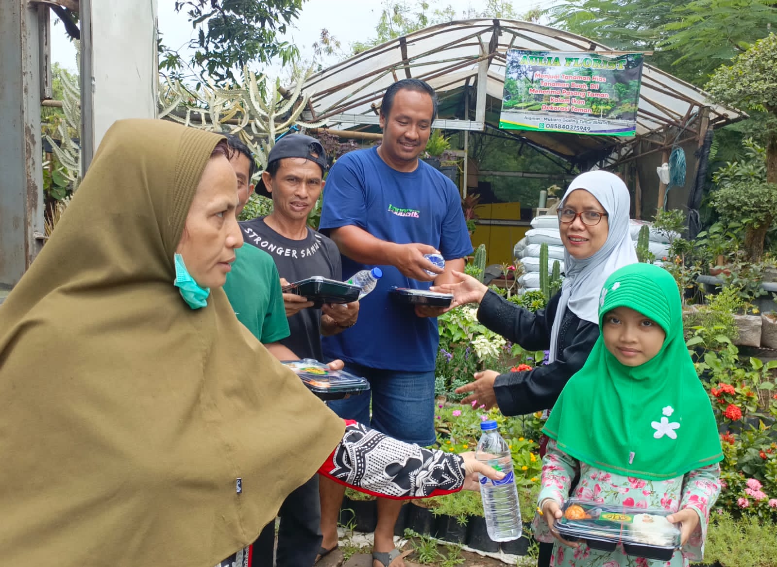 Dari situ Tim PJBW menuju kawasan Sumarecon. Di sana bertemu para tukang kebon alias perawat tanaman. Mereka juga tak menolak saat ditawari nasi boks Jumat Berkah Wartawan. Dan, secara kebetulan memang belum makan siang.