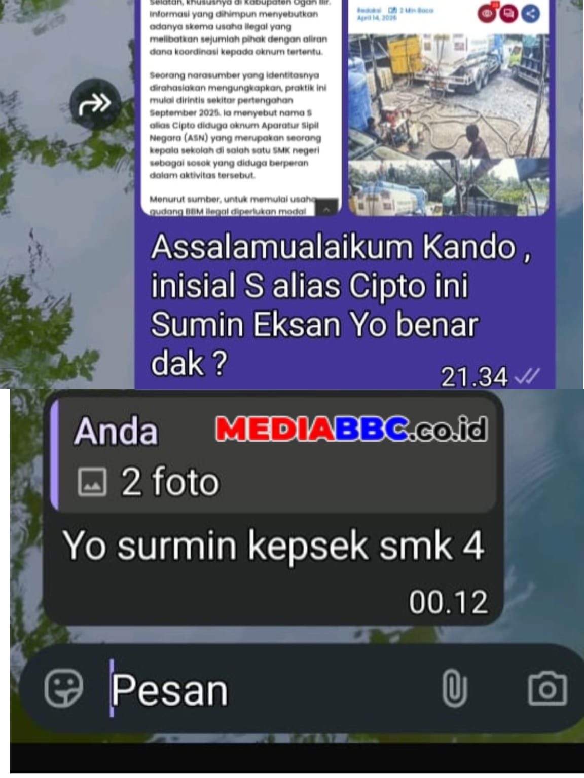 MEDIABBC.co.id,PALEMBANG – Seorang Aparatur Sipil Negara (ASN) yang menjabat sebagai Kepala SMK Negeri 4 Palembang berinisial SE alias Cipto, diduga kuat menjadi investor utama dalam jaringan mafia distribusi Bahan Bakar Minyak (BBM) ilegal di Kabupaten Ogan Ilir. Berdasarkan data yang dihimpun tim investigasi, praktik sistematis pengoplosan BBM subsidi ini diduga telah beroperasi sejak September 2025 dengan dukungan modal besar.