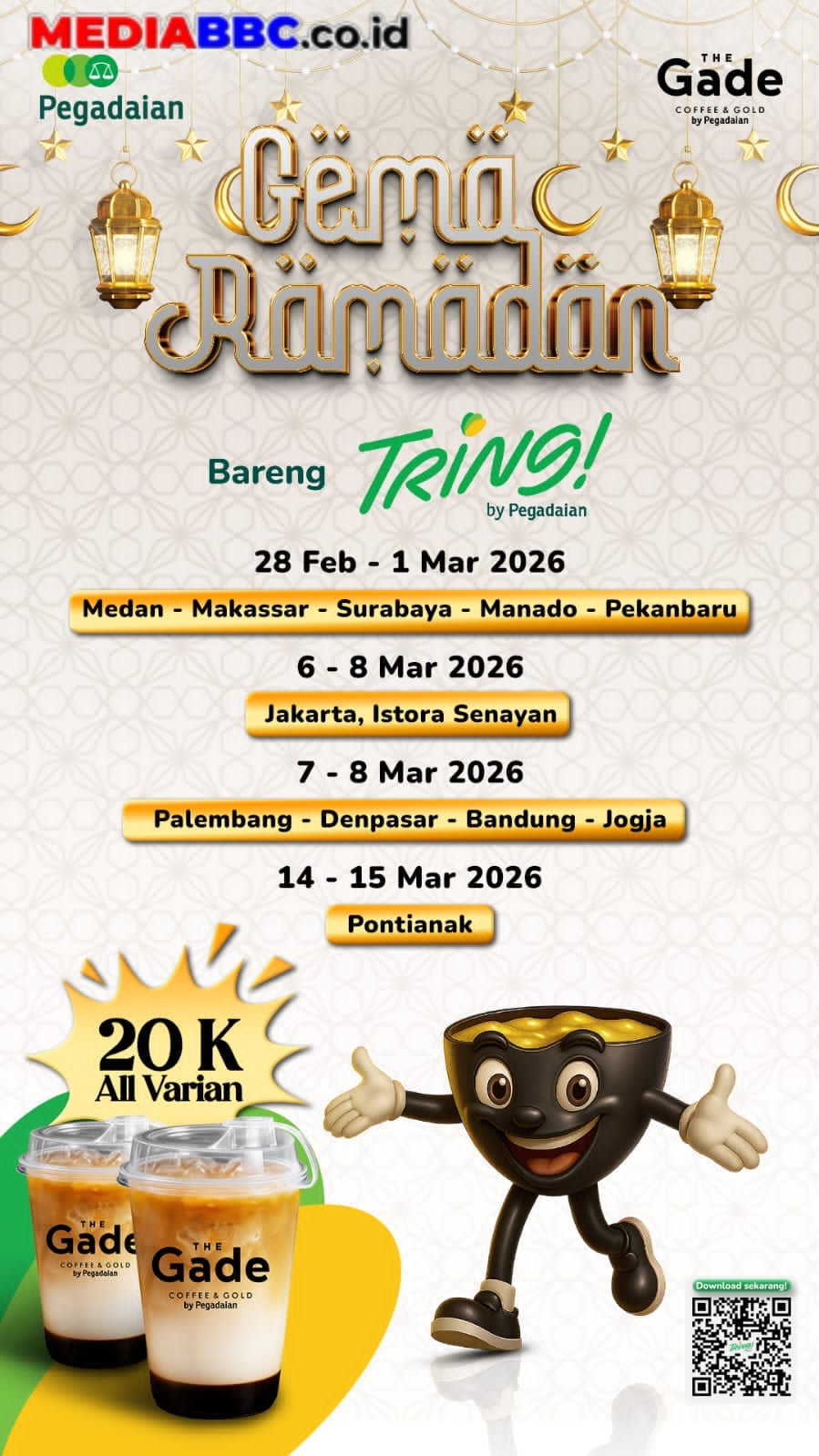 Dalam rangka menyemarakkan bulan suci Ramadan 1447 H, Pegadaian Kantor Wilayah III Palembang akan menggelar kegiatan bertajuk “Ramadan Bareng TRING! by Pegadaian” yang dilaksanakan pada 7–8 Maret 2026 di PSCC Icon Mall Palembang.