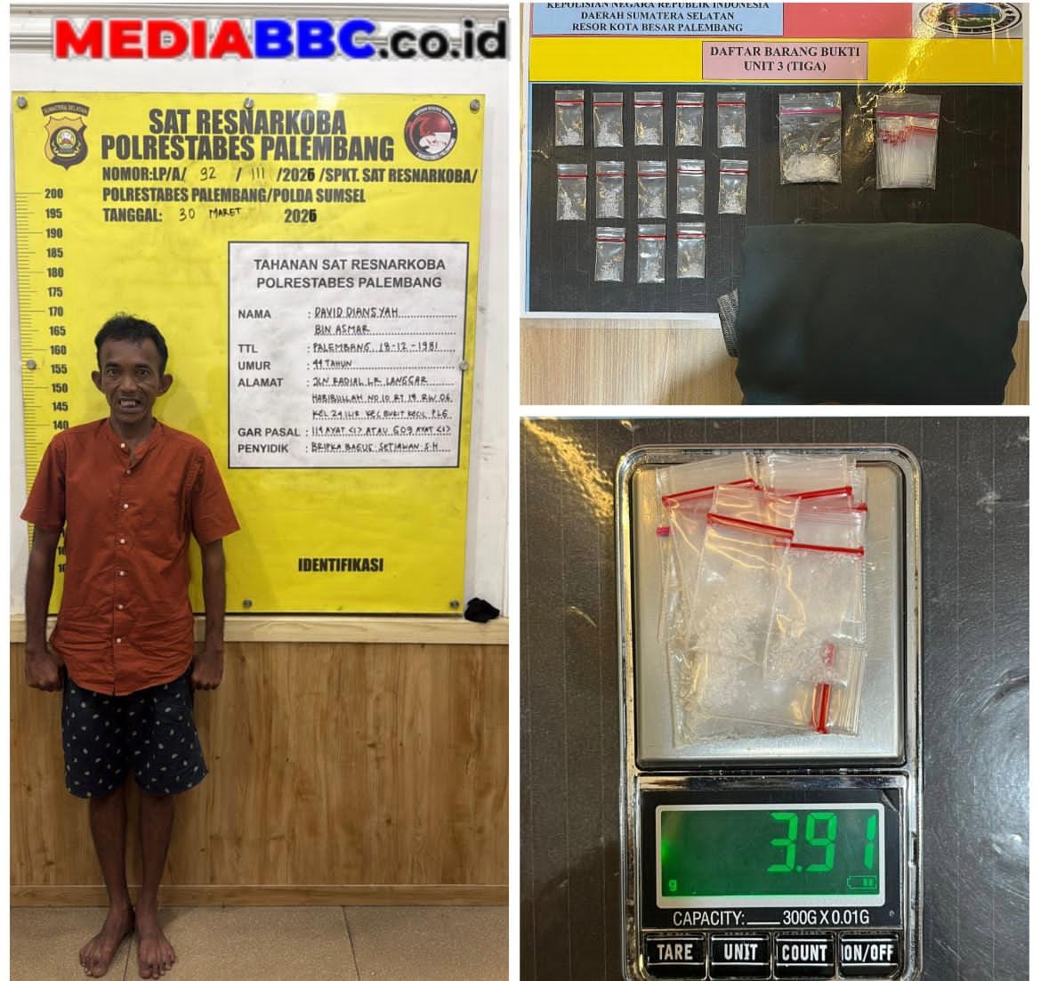 MEDIABBC.co.id, PALEMBANG — Kepolisian Daerah Sumatera Selatan melalui Unit 3 Satuan Reserse Narkoba Polrestabes Palembang kembali berhasil mengungkap kasus peredaran narkotika jenis sabu di wilayah Kota Palembang. Seorang tersangka pengedar berhasil diamankan di kawasan Jalan Letnan Mukmin, Gang Bulan, Kelurahan 24 Ilir, Kecamatan Bukit Kecil.