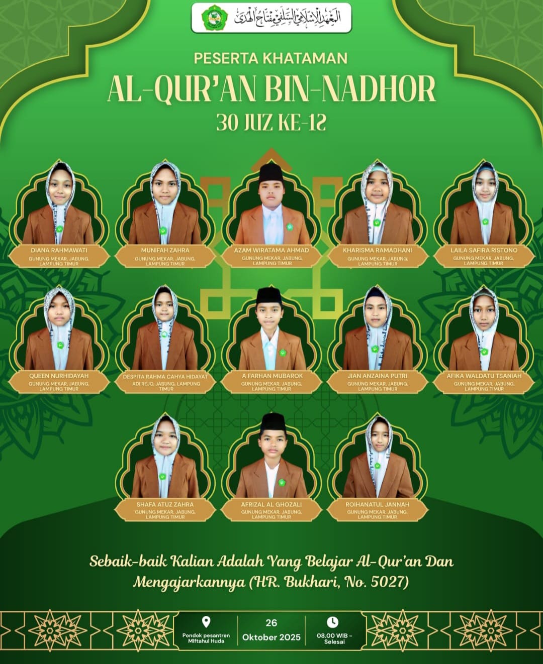 Melalui momentum ini, Pondok Pesantren Miftahul Huda Lampung Timur menegaskan komitmennya untuk terus mencetak generasi muda yang tidak hanya unggul dalam hafalan, tetapi juga memiliki akhlak mulia, kecerdasan spiritual, serta kepedulian sosial yang tinggi.