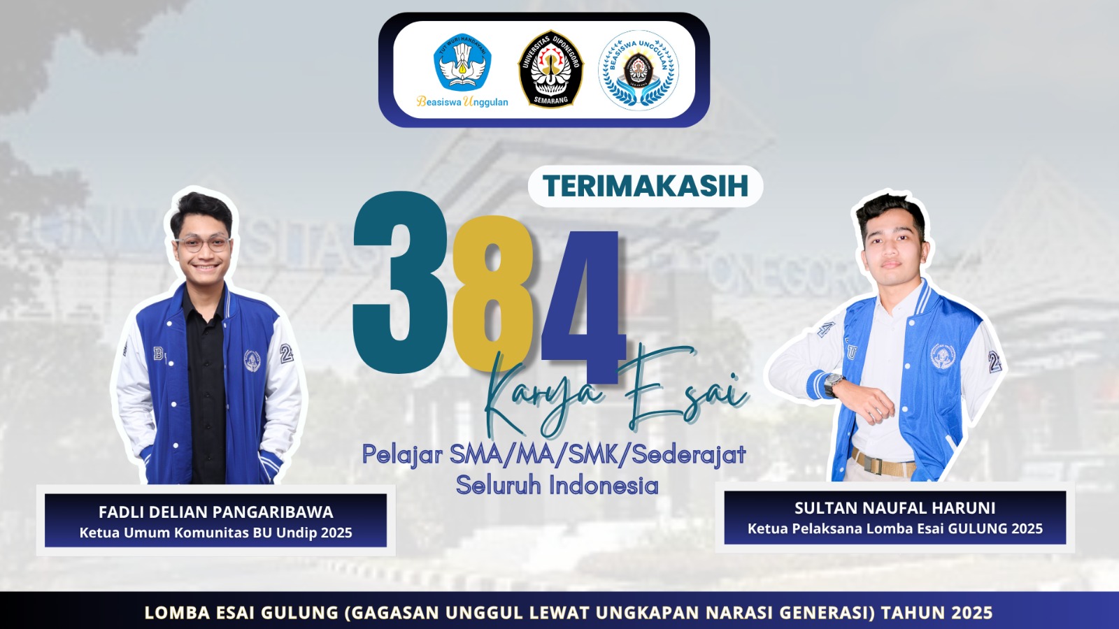 MEDIABBC.co.id – Semarang (7 November 2025) – Komunitas Beasiswa Unggulan Universitas Diponegoro (BU Undip) telah sukses menyelenggarakan kegiatan Lomba Esai GULUNG (Gagasan Unggul Lewat Ungkapan Narasi Generasi) Tahun 2025 yang diikuti oleh ratusan pelajar SMA/MA/SMK/sederajat dari seluruh Indonesia.