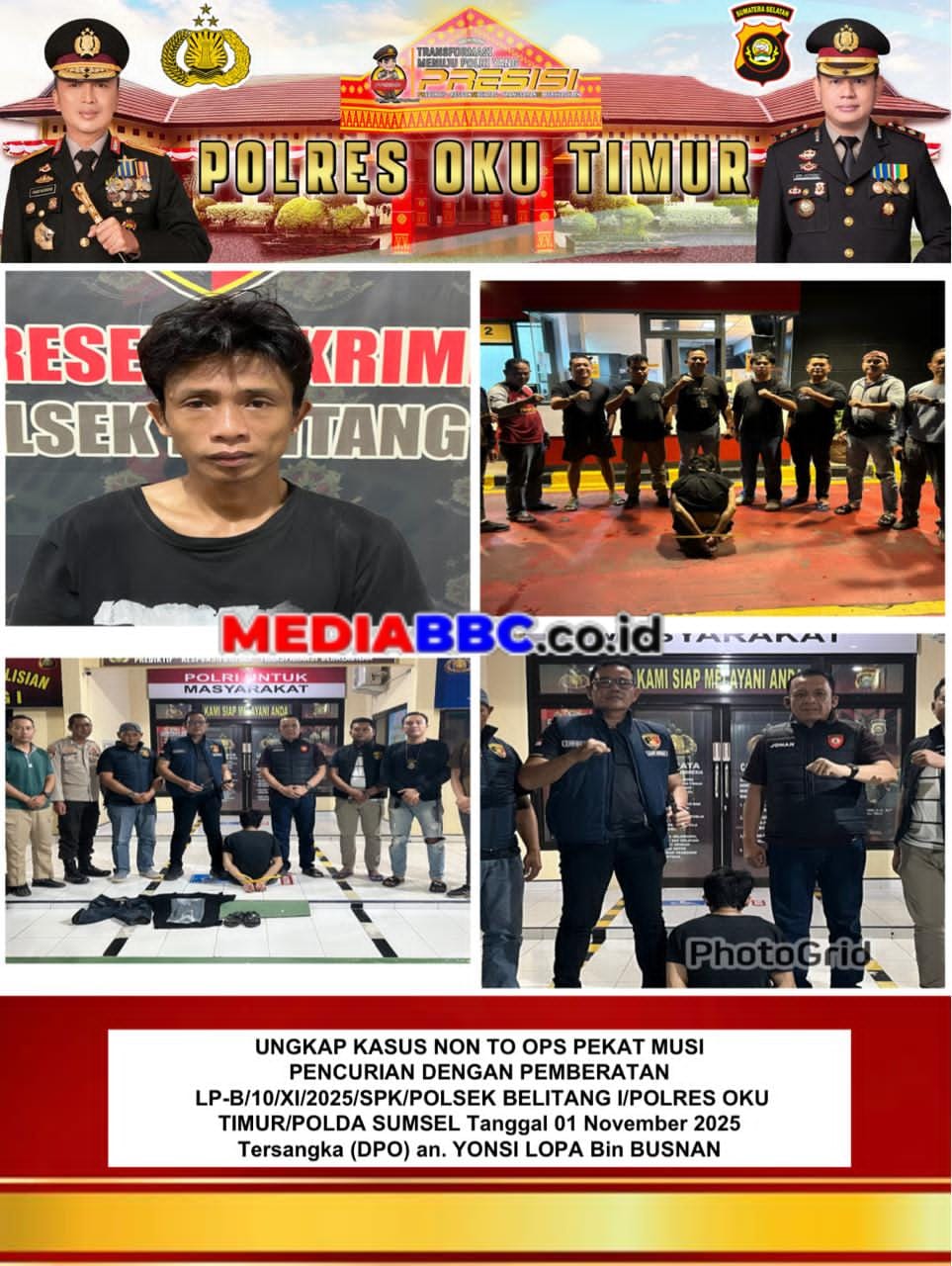 MEDIABBC.co.id, Palembang – Pelarian lima bulan seorang buronan kasus pencurian sepeda motor di rumah ibadah akhirnya terhenti. Tim gabungan Jatanras Polda Sumatera Selatan dan Polsek Belitang I meringkus Y.L. (32), Daftar Pencarian Orang (DPO) kasus pencurian motor di Gereja HKBP Belitang, Kabupaten OKU Timur.
