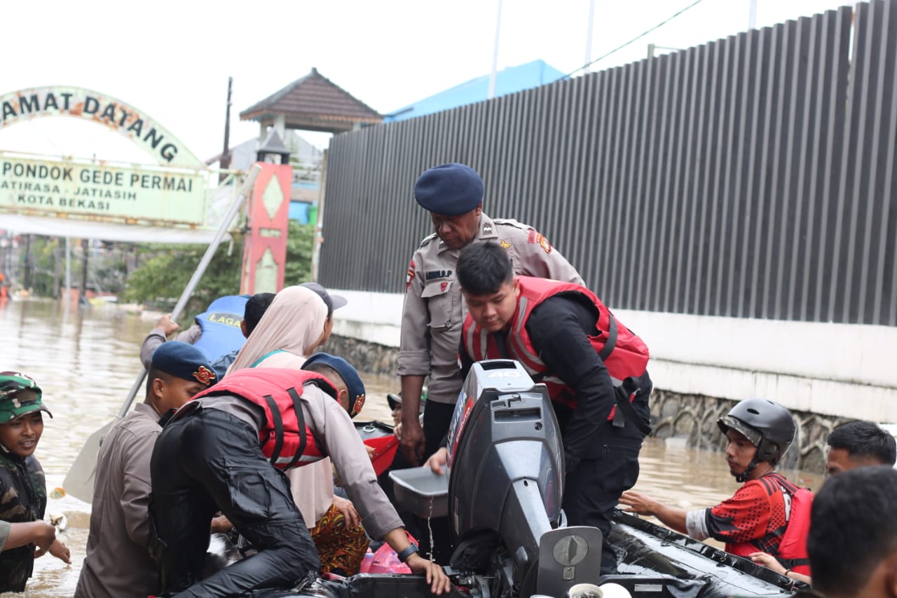 MEDIABBC.co.id,Bekasi, 4 Maret 2025 – Tim Search and Rescue (SAR) dari Batalyon D Pelopor Satuan Brimob Polda Metro Jaya dikerahkan untuk melakukan evakuasi korban banjir di Pondok Gede Permai, Jatirasa, Kecamatan Jatiasih, Kota Bekasi. Dengan kekuatan 10 personel yang dipimpin oleh Ipda Rudi, tim bergerak cepat menuju lokasi terdampak guna memastikan keselamatan warga yang terjebak banjir dengan ketinggian air mencapai ± 2-3 meter.