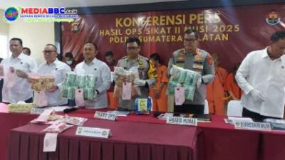 MEDIABBC.co.id, PALEMBANG— Polda Sumatera Selatan menunjukkan taringnya. Dalam rentang akhir Oktober hingga November 2025, aparat menggulung 1.127 tersangka dari berbagai tindak kriminal dalam Operasi Sikat II Musi 2025. Hal ini ditegaskan langsung oleh Kabid Humas Polda Sumsel Kombes Pol Nandang Mu’min Wijaya saat rilis resmi, Senin (17/11/2025). Direktorat Reserse Kriminal Umum (Ditreskrimum) Polda Sumsel bersama […]