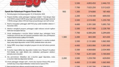 MEDIABBC.co.id,Jakarta– Dalam semangat memperingati Hari Pahlawan 2025, PT PLN (Persero) menghadirkan program promo bertajuk “Power Hero”, yang memberikan diskon 50% untuk biaya tambah daya listrik bagi pelanggan setia. Promo ini berlangsung secara nasional mulai 10 hingga 23 November 2025 dan dapat diakses dengan mudah melalui aplikasi PLN Mobile. Program ini ditujukan bagi pelanggan tegangan rendah […]